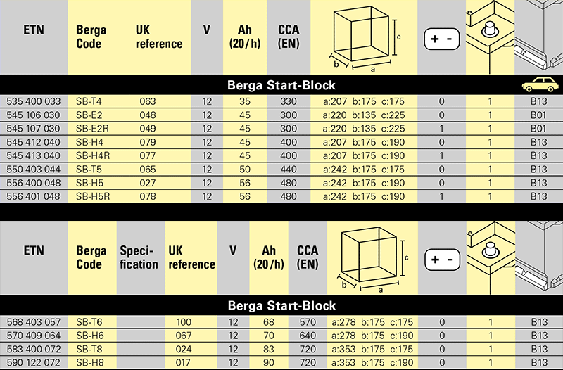 Berga bietet drei Batterielinien für unterschiedliche Anforderungen: Vom Berga Power-Block für höchste Leistungen in modernen Fahrzeugen mit vielen Verbrauchern über den Berga Basic-Block für alle Anwendungen, die einen Energiebedarf im mittleren Bereich haben bis hin zum Berga Start-Block für Fahrzeuge, die älter als 10 Jahre sind und über wenige elektrische Verbraucher verfügen.